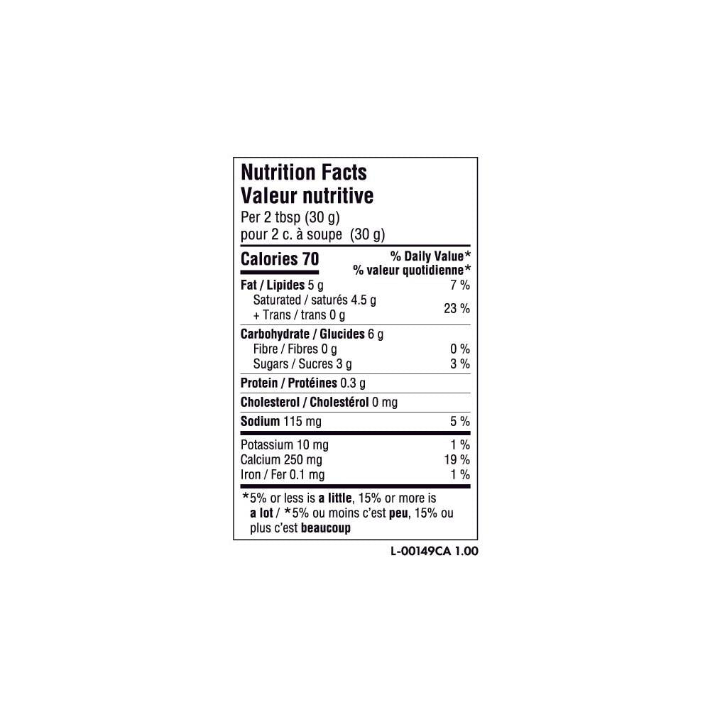 Daiya Oat Cream™ Blend (Water, Gluten-free Oat Flour, Pea Protein, Bacterial Cultures, Microbial Enzymes), Coconut Oil, Cane Sugar, Modified Potato Starch, Salt, Vanilla Extract, Turmeric, Caramel (Colour), Nutmeg, Cinnamon, Locust Bean Gum, Tricalcium Phosphate, Lactic Acid, Natural Flavours.